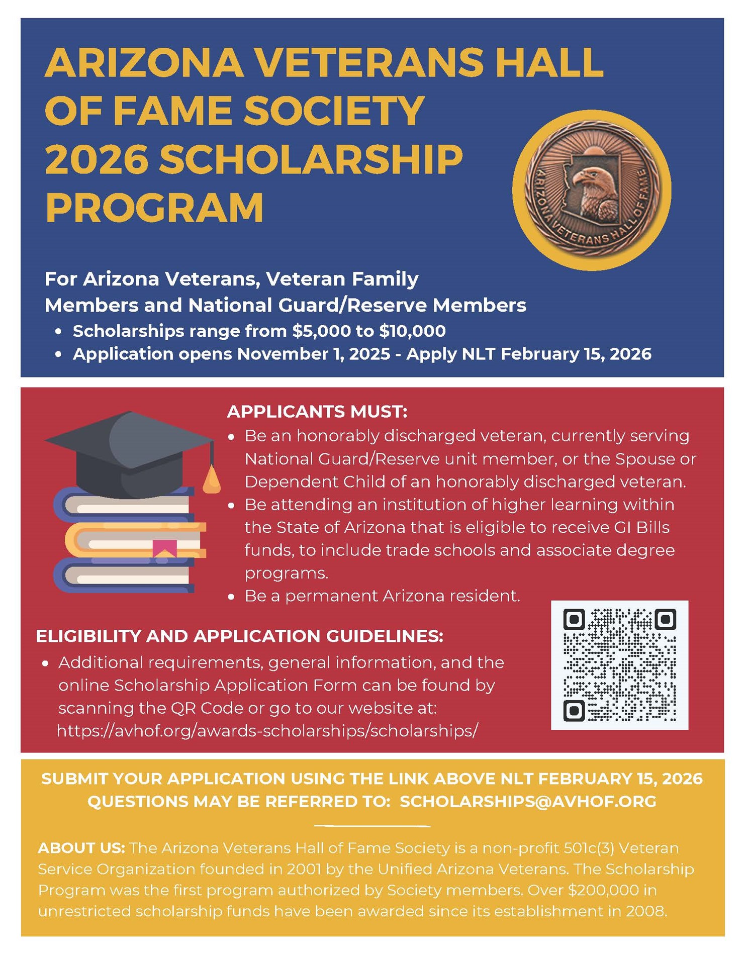 As you know, the AVHOFS Scholarship Program was one of the first programs developed after establishment of the Society in 2007 and remains one of our major programs today with over $200,000 in unrestricted scholarships awarded to date. Scholarship Committee Chair Christine Mahon (Class of 2017) encourages you to share the attached scholarship flyer with eligible veterans, NG/Reserve members, institutions of higher learning (to include Community Colleges and Trade Schools), and other Veteran Service Organizations. Note the deadline to apply is February 15, 2026. More information, a PDF copy of the Scholarship Flyer, and the online Application Form can be found on our website HERE. Information about the UAV’s Scholarship Program can be found on their website at: www.azuav.org